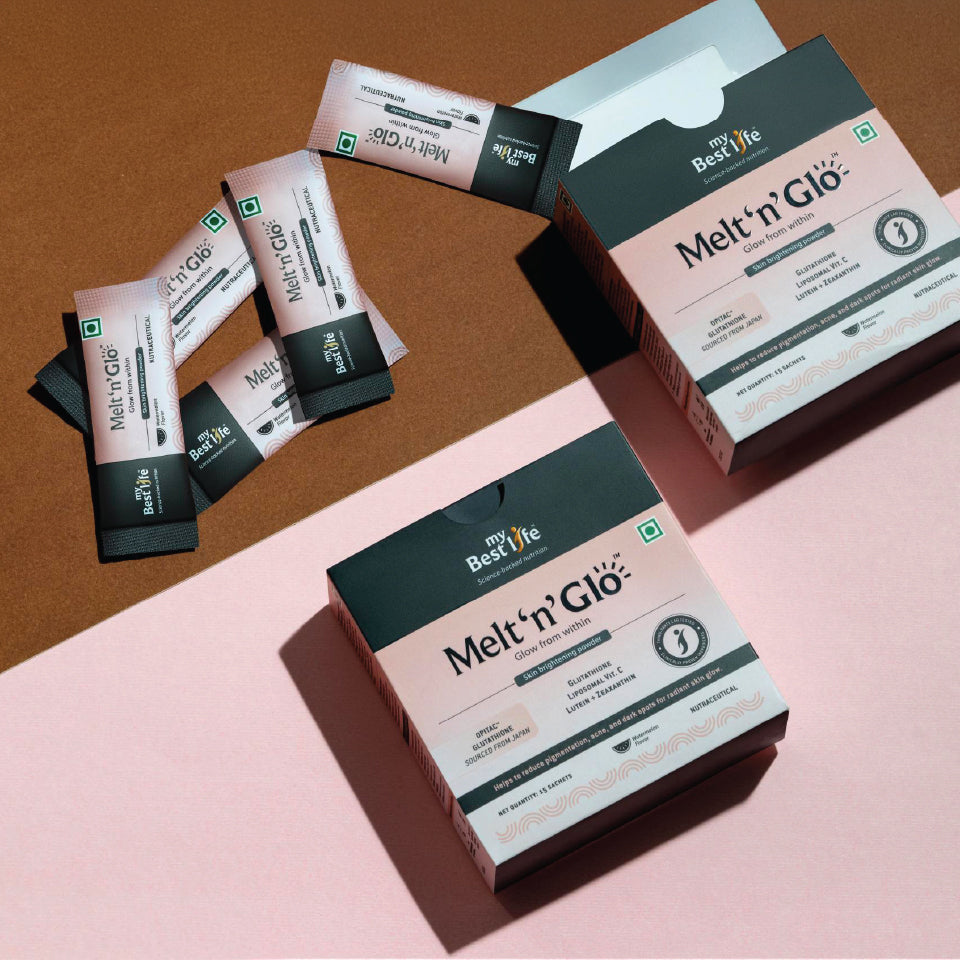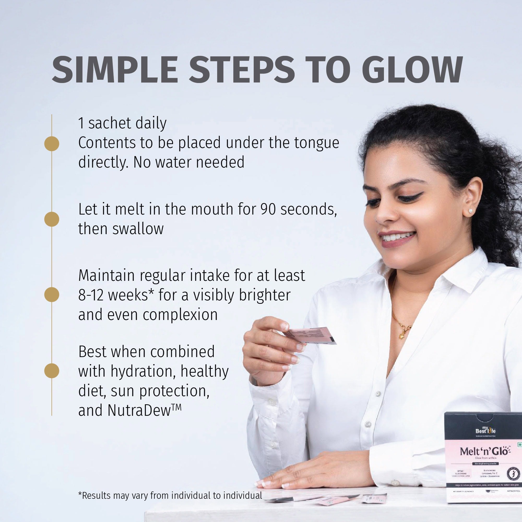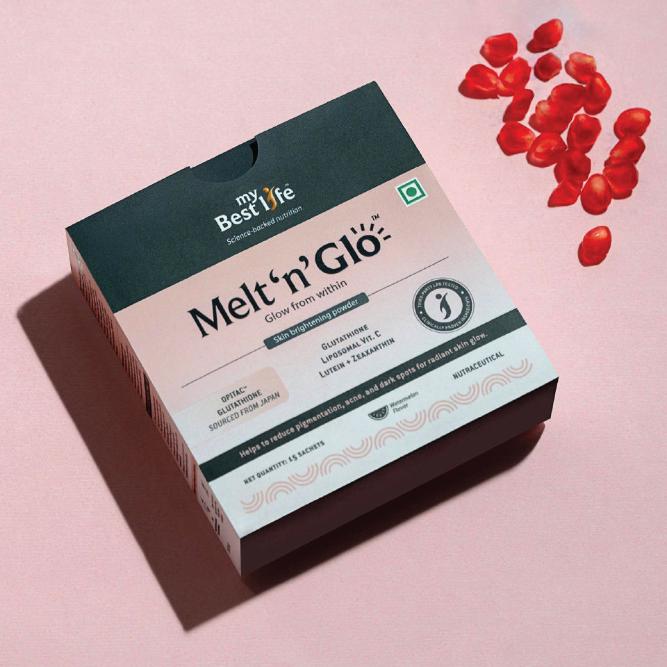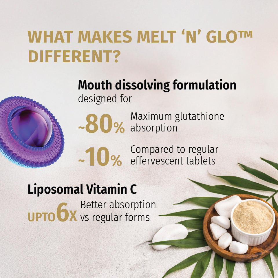 Melt ‘n’ Glo™ is a clinically backed oral skin brightening supplement designed to reduce pigmentation, fade dark spots, and enhance overall skin radiance. It works from within using potent antioxidants like Glutathione, Vitamin C, and Lutein + Zeaxanthin to combat oxidative stress and environmental damage.