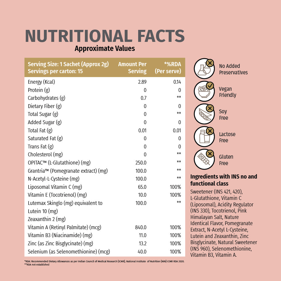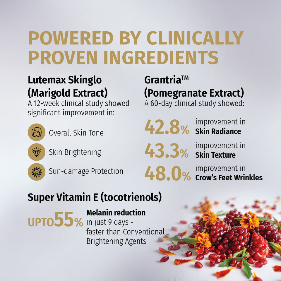 Powered by advanced ingredients like Glutathione (Opitac), Liposomal Vitamin C, Marigold extract (Lutemax Skinglo), and Pomegranate extract (Grantria), it helps: