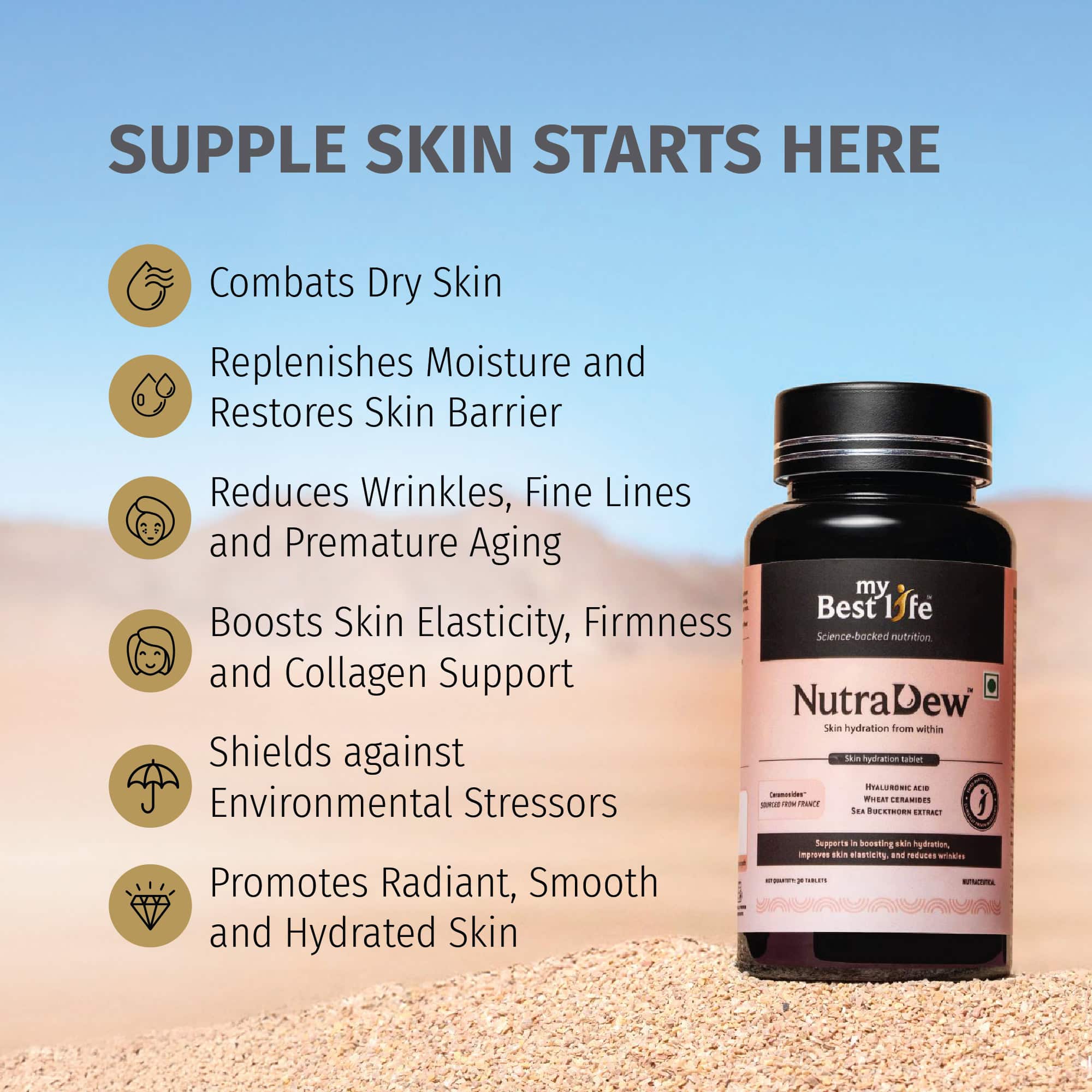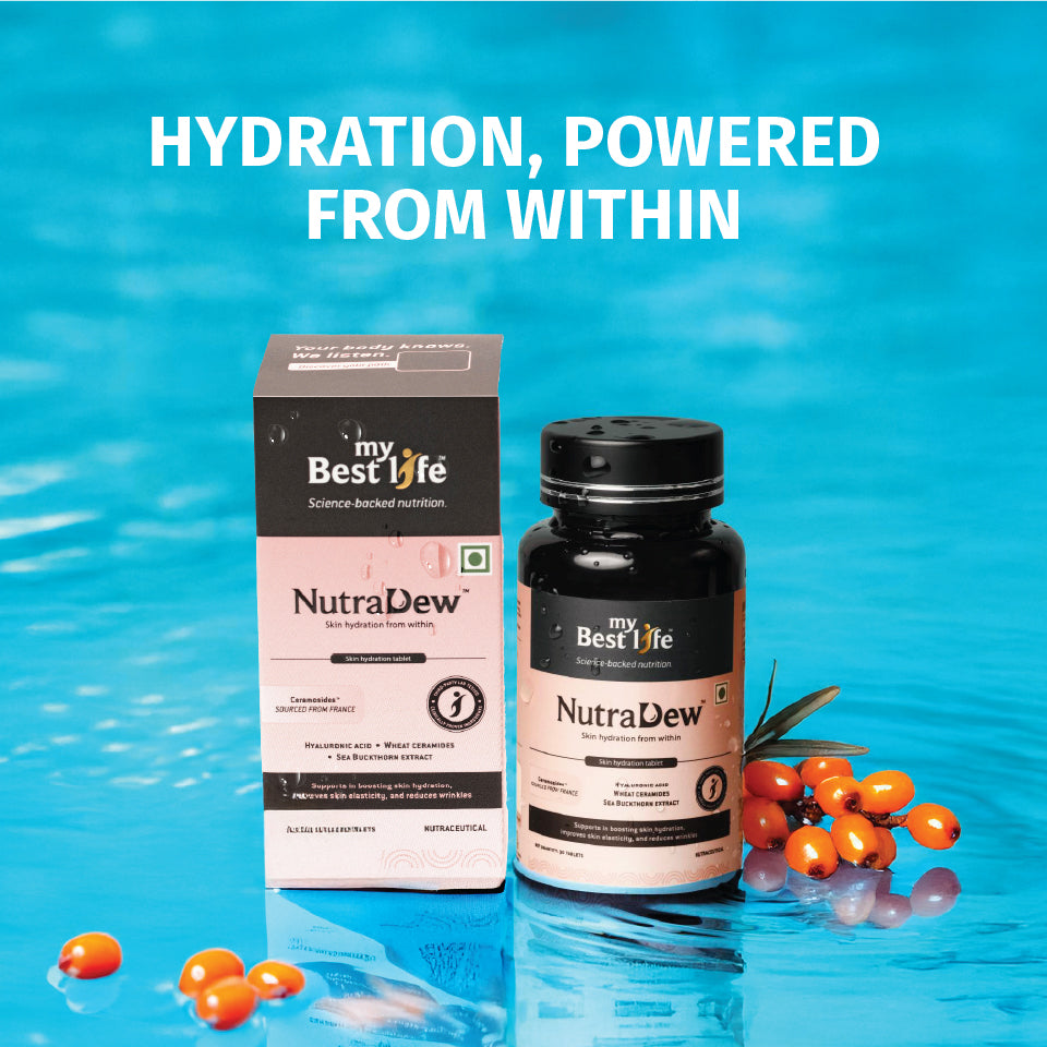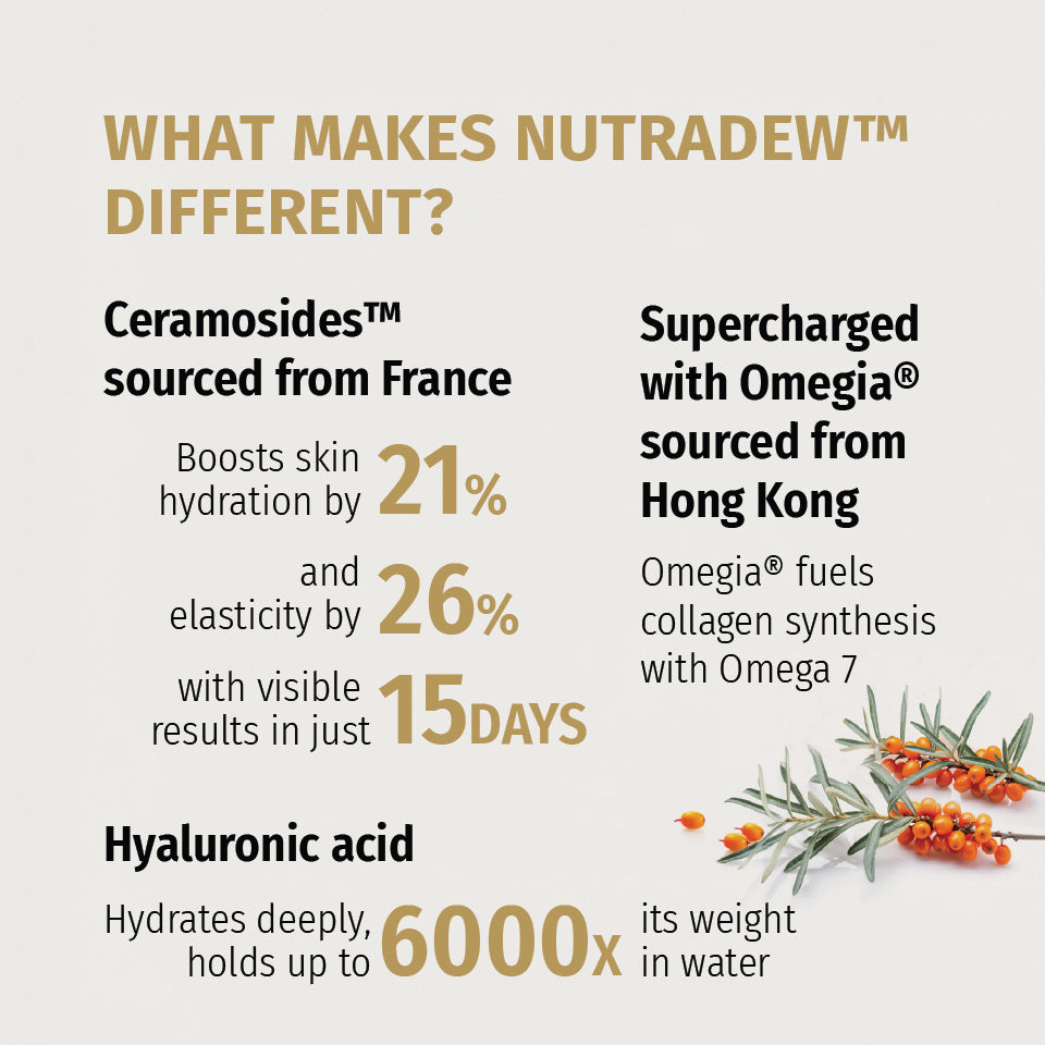 NutraDew™ is a scientifically formulated skin hydration supplement designed to hydrate, nourish, restore, and protect the skin from within. Powered by clinically proven phytoceramides (Ceramosides™) to reinforce the skin barrier, hyaluronic acid for deep hydration, alpha-lipoic acid (ALA) for antioxidant defense, and Omegia® (sea buckthorn extract) for skin regeneration, NutraDew™ helps combat dryness, loss of elasticity, and premature aging - ensuring smooth, supple skin for modern lifestyles.