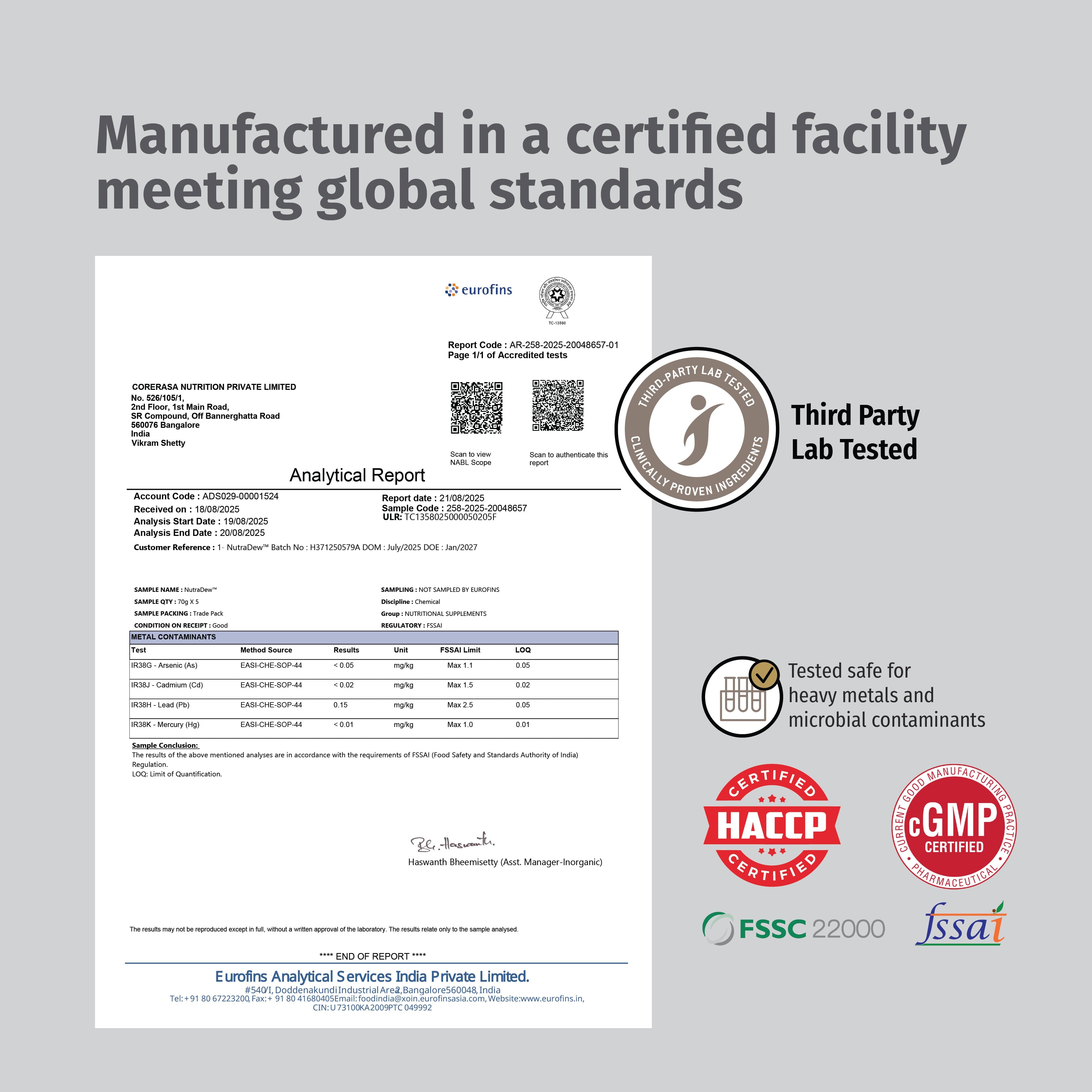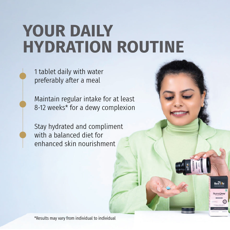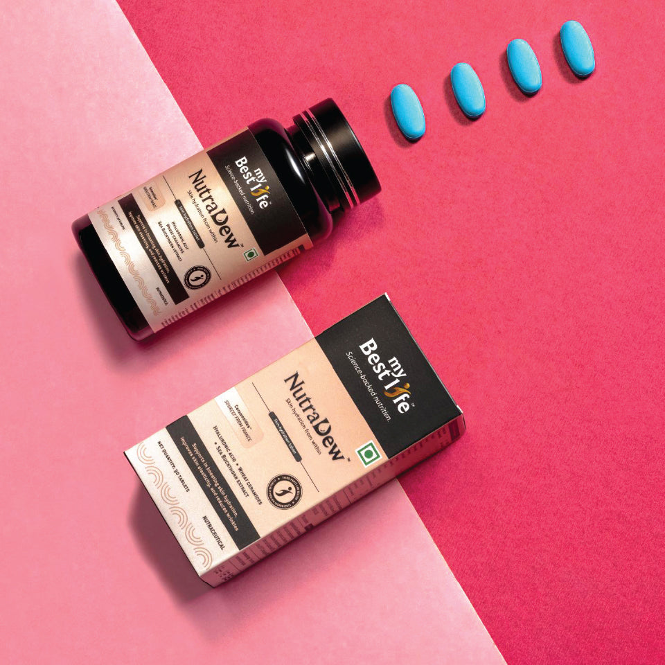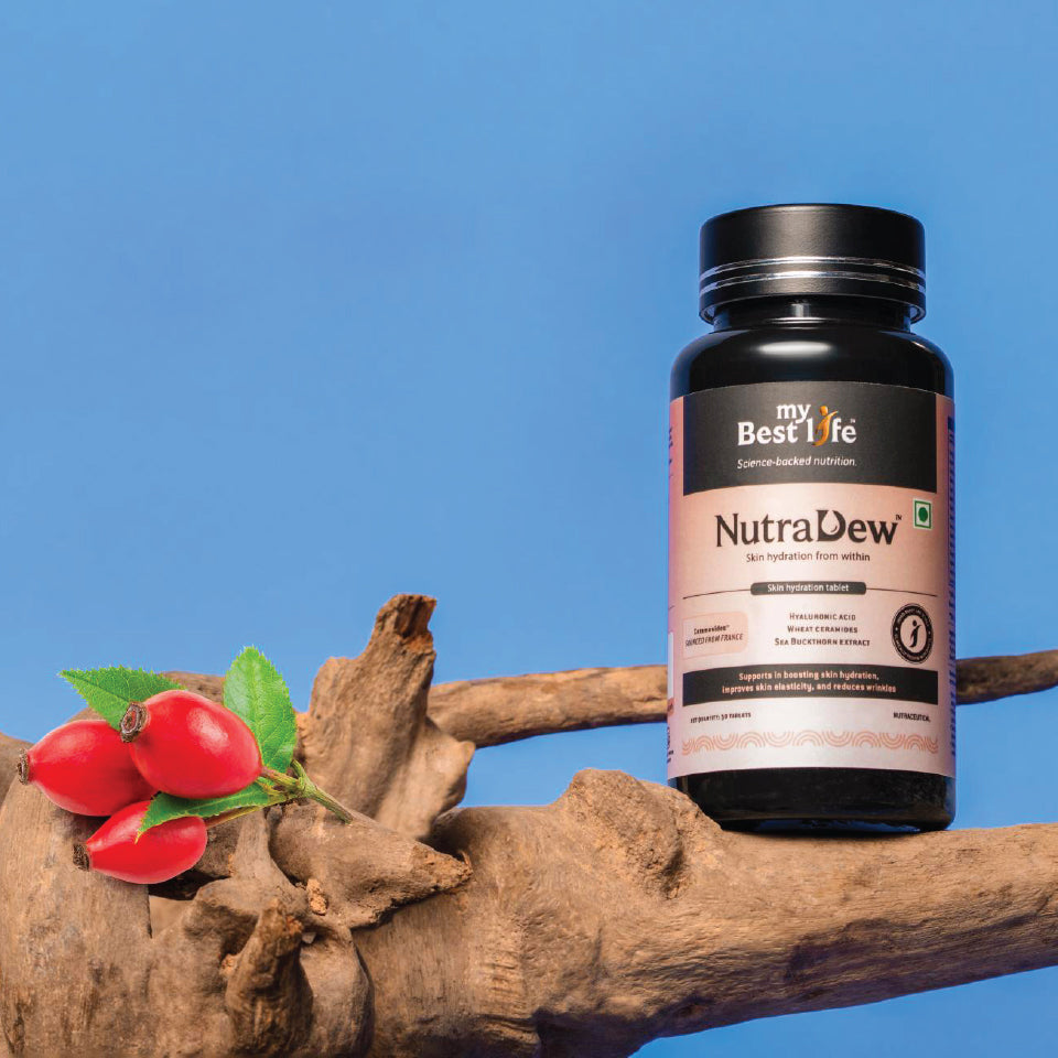 NutraDew™ is a scientifically formulated skin hydration supplement designed to hydrate, nourish, restore, and protect the skin from within. Powered by clinically proven phytoceramides (Ceramosides™) to reinforce the skin barrier, hyaluronic acid for deep hydration, alpha-lipoic acid (ALA) for antioxidant defense, and Omegia® (sea buckthorn extract) for skin regeneration, NutraDew™ helps combat dryness, loss of elasticity, and premature aging - ensuring smooth, supple skin for modern lifestyles.