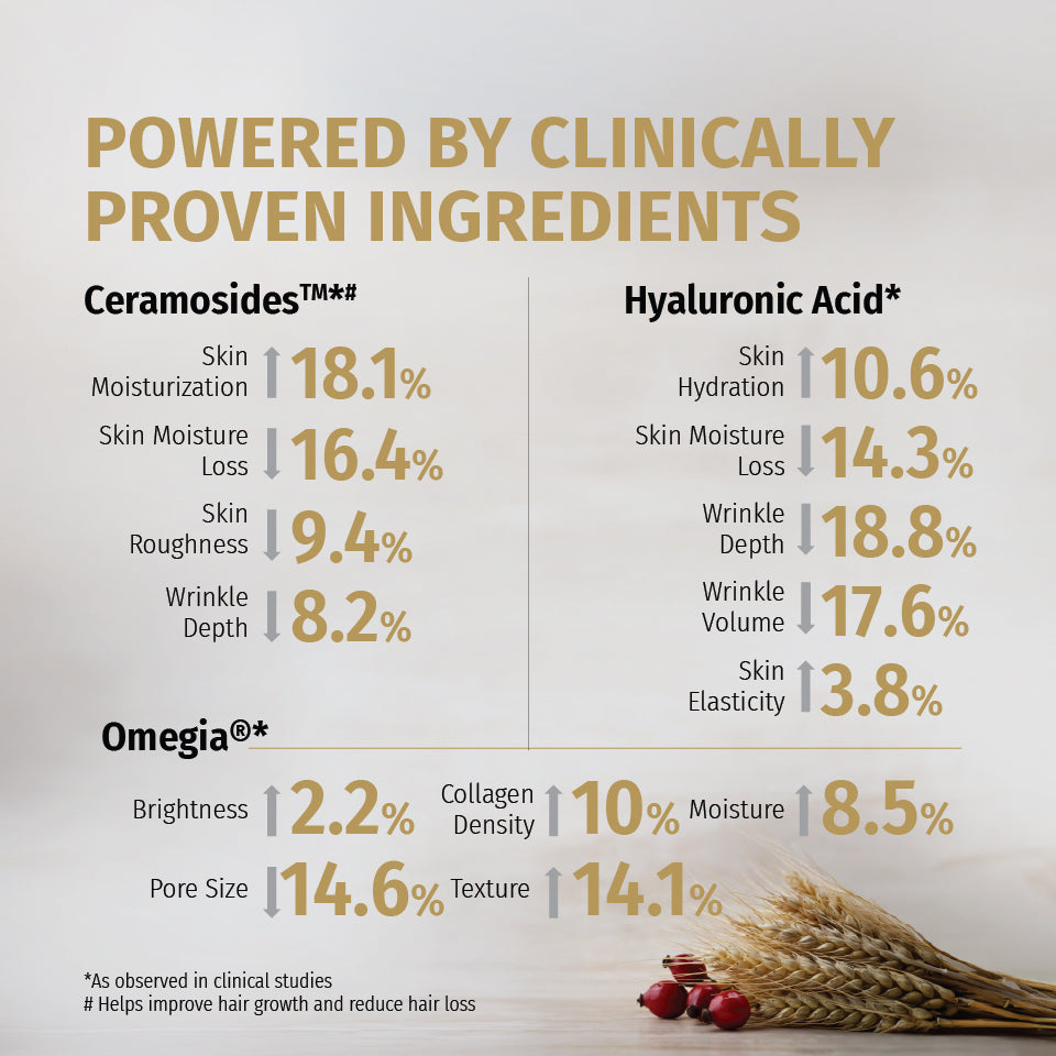 Phytoceramides are ingested, absorbed, and converted into ceramides, which restore the skin barrier, boost hydration, reduce trans-epidermal water loss (TEWL), and protect the skin.Proven By Science